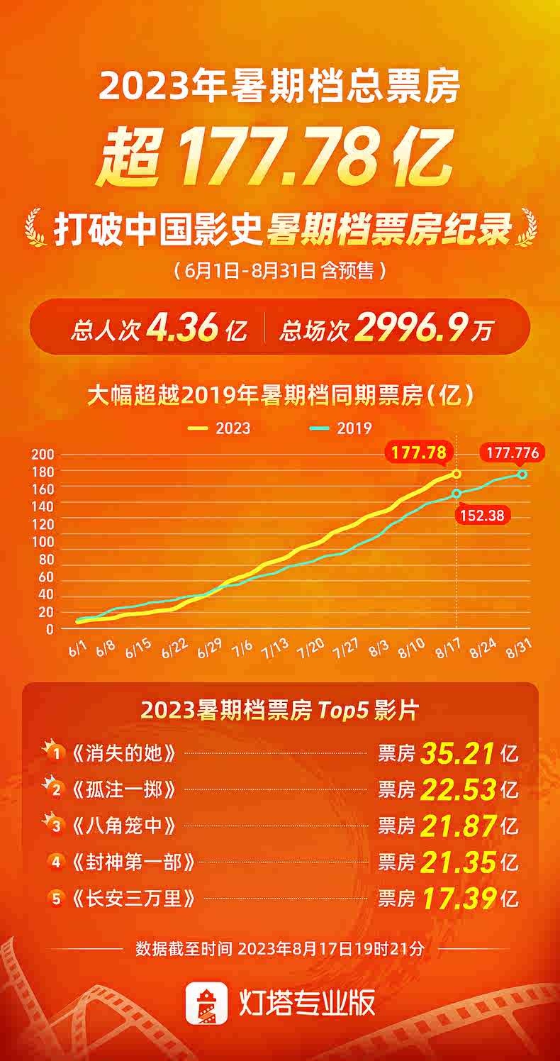 暫列2023年暑期檔票房榜前五名影片分別為:《消失的她》《孤注一擲》《八角籠中》《封神第一部》《長安三萬里》。