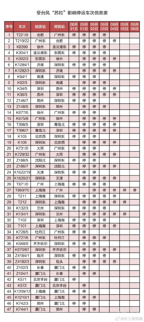 記者從中國鐵路上海局集團(tuán)有限公司獲悉,受第9號(hào)臺(tái)風(fēng)“蘇拉”影響,為確保列車運(yùn)行安全,鐵路部門計(jì)劃對(duì)杭深線、京港高鐵、廣深城際、廣深港高鐵、穗深城際、京九線等線路運(yùn)行的部分列車采取停運(yùn)措施。截至30日17時(shí)30分,計(jì)劃停運(yùn)8月31日至9月6日間共121趟旅客列車:其中停運(yùn)動(dòng)車組列車74趟,停運(yùn)普速列車47趟。