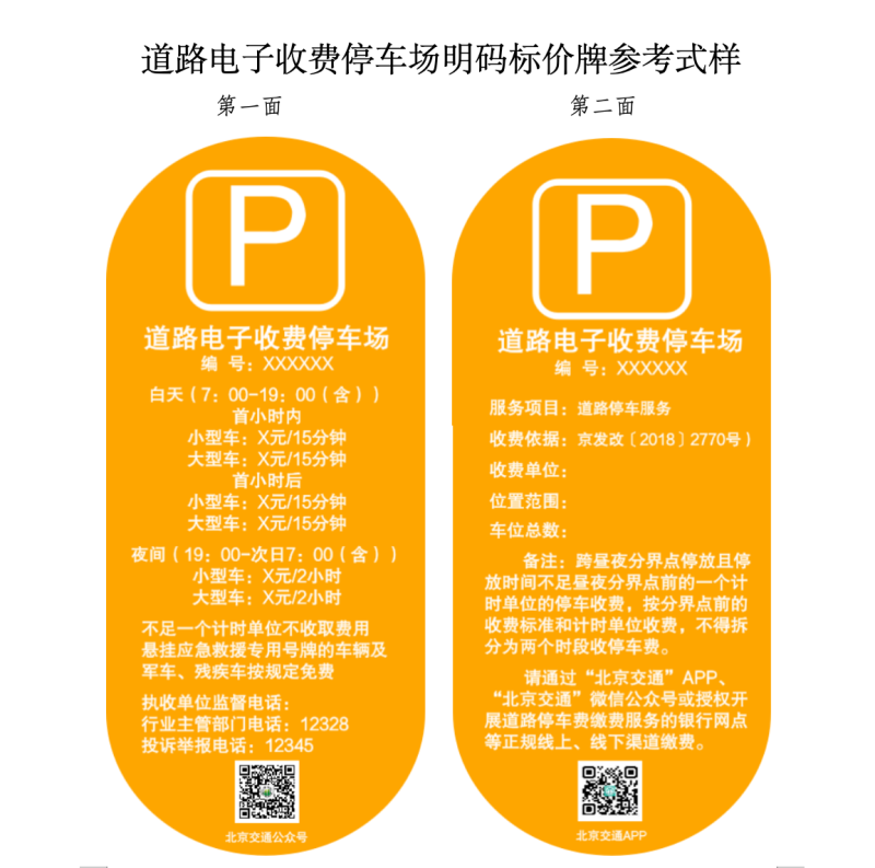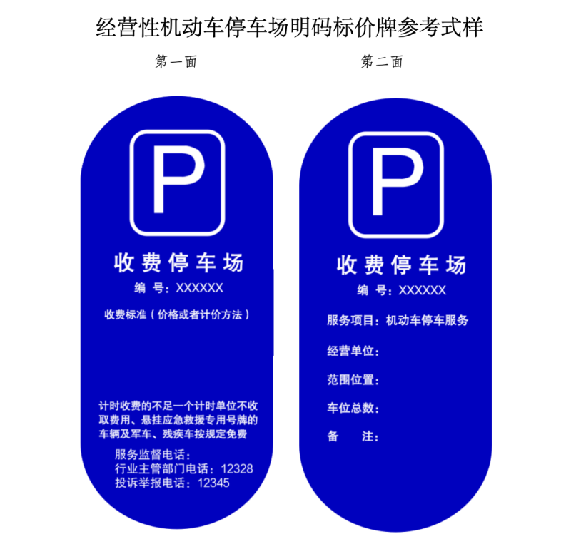 根據(jù)相關(guān)法規(guī)政策的新要求,按照依法合規(guī)、便民利民、不做大改的原則,征求意見稿對(duì)兩種機(jī)動(dòng)車停車場(chǎng)明碼標(biāo)價(jià)牌參考式樣進(jìn)行了修改完善,并附上“經(jīng)營性機(jī)動(dòng)車停車場(chǎng)明碼標(biāo)價(jià)牌參考式樣”和“道路電子收費(fèi)停車場(chǎng)明碼標(biāo)價(jià)牌參考式樣”,供相關(guān)單位參照自行制作明碼標(biāo)價(jià)牌,明碼標(biāo)價(jià)牌編號(hào)為北京市公共停車場(chǎng)經(jīng)營備案證的備案號(hào)。