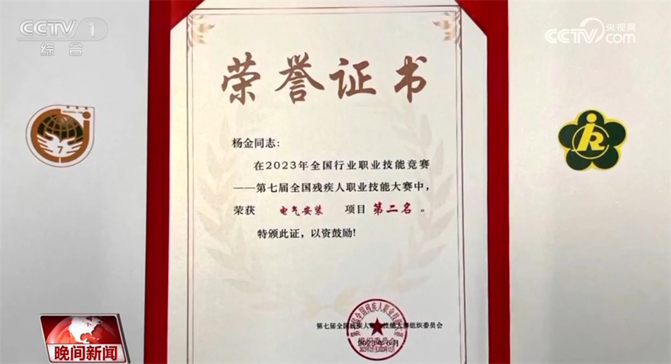 今年,在取得第七屆全國殘疾人職業(yè)技能大賽參賽資格后,楊金每天都堅持12小時的高強度訓練,最終在電氣安裝項目上拿到了銀牌。