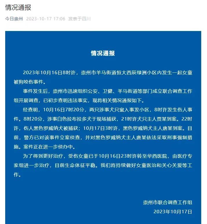 10月17日,四川崇州聯(lián)合工作組發(fā)布通報(bào)稱,經(jīng)查明,10月16日7時(shí)20分,兩只涉事犬只竄入事發(fā)小區(qū),8時(shí)許,發(fā)生傷人事件。8時(shí)20分,涉事白色拉布拉多犬于現(xiàn)場(chǎng)捕獲,21時(shí)許犬只主人賈某到案。22時(shí)許,傷人黑色羅威納犬被捕獲;10月17日3時(shí)許,黑色羅威納犬主人唐某到案。