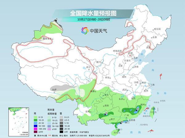 明天開始,降雨的重心將逐漸向華南轉(zhuǎn)移。預(yù)計(jì)新疆北疆北部、西藏東部等地部分地區(qū)有小到中雪或雨夾雪,局地大雪。西南地區(qū)大部、江南大部、華南等地有小到中雨,局地大雨。