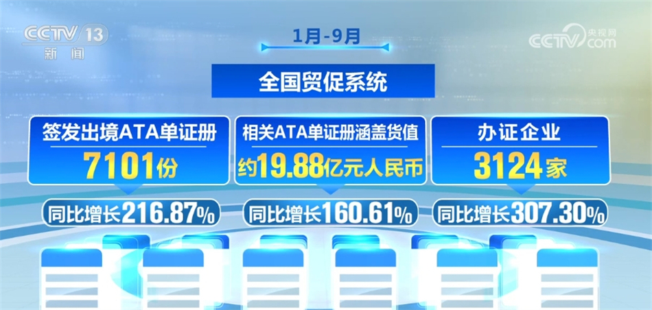 1月—9月,全國貿(mào)促系統(tǒng)共簽發(fā)出境ATA單證冊7101份,同比增長216.87%;相關ATA單證冊涵蓋貨值約19.88億元人民幣,同比增長160.61%;辦證企業(yè)3124家,同比增長307.30%。