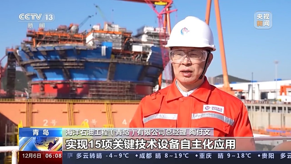 海洋石油工程(青島)有限公司總經(jīng)理 陶付文:創(chuàng)新采用一體化建造工藝和雙龍門吊集成技術(shù),實現(xiàn)15項關(guān)鍵技術(shù)設(shè)備自主化應(yīng)用,使我國具備了根據(jù)不同油田、不同海域,自主設(shè)計制造不同類型深水油氣裝備的能力。