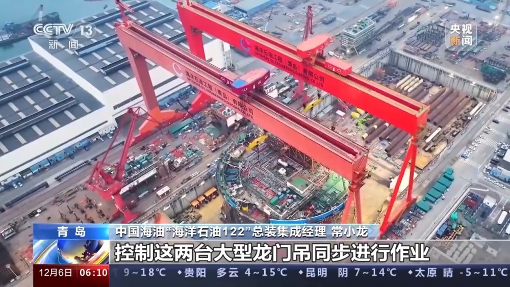 中國海油“海洋石油122”總裝集成經(jīng)理 常小龍:我們是通過數(shù)字化系統(tǒng),控制這兩臺大型龍門吊同步進行作業(yè),創(chuàng)新采用了插尖輔助定位技術(shù),插尖都在每個模塊下部,每個都有十幾個插尖,我們最終給它的定位精度控制在了4毫米以內(nèi),我們這樣的方式也加快了整體作業(yè)效率,平均每兩天吊一個模塊,整體作業(yè)效率提高了50%以上。