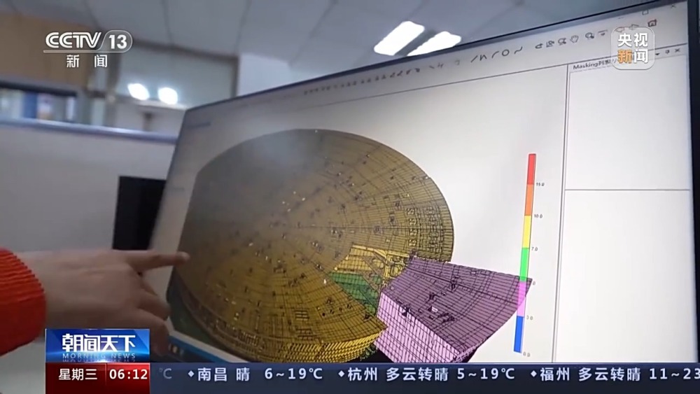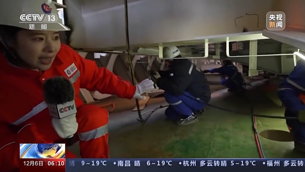 總臺央視記者 張叢婧:可以看到能源碗里的空間非常狹窄,因為這些模塊由幾十萬個零部件組成,集成度很高,我們現(xiàn)在進一個施工現(xiàn)場里看一下。工人師傅們正在這里鋪設(shè)電纜,他們都是要蹲著,像這樣挪動才能夠完成這些操作。我發(fā)現(xiàn)其實像這樣的高難度施工,幾乎涉及所有的工種。