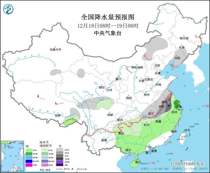 12月18日08時(shí)至19日08時(shí),內(nèi)蒙古中東部、吉林南部、遼寧中東部、西藏東部、青海南部、甘肅河西、西南地區(qū)東南部、江漢東部、江淮、江南北部等地的部分地區(qū)有小雪或雨夾雪,其中,安徽中東部、江蘇中西部等地的部分地區(qū)有中到大雪(5~7毫米)。江南大部、華南北部等地的部分地區(qū)有小到中雨。內(nèi)蒙古中西部、黑龍江東南部、遼東半島等地的部分地區(qū)有4~6級(jí)風(fēng),西藏北部的部分地區(qū)有7~8級(jí)風(fēng)(見圖3)。