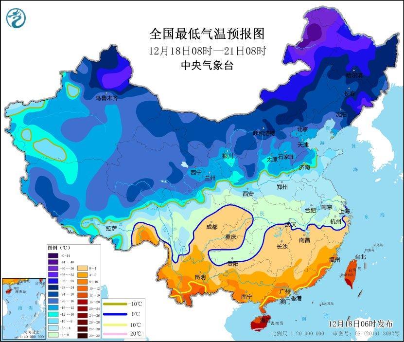 圖2 全國(guó)最低氣溫預(yù)報(bào)圖(12月18日08時(shí)-21日08時(shí))
