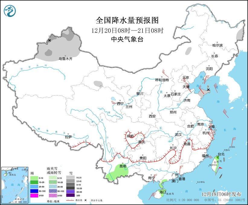 12月19日08時(shí)至20日08時(shí),新疆北疆北部、吉林東南部、遼寧東部、西藏東北部、青海北部和東部、甘肅河西、山東半島、川西高原北部、貴州西部、安徽南部、江蘇中南部、江西北部等地的部分地區(qū)有小雪或雨夾雪。江南中南部、云南東南部、華南中北部、海南島、臺(tái)灣島等地的部分地區(qū)有小到中中雨。內(nèi)蒙古中部、青海南部、吉林西部、遼東半島、山東半島、江蘇南部、浙江北部、廣東沿海等地的部分地區(qū)有4~6級(jí)風(fēng)(見圖4)。