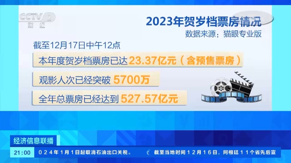 某電影數(shù)據(jù)平臺(tái)顯示,截至12月17日中午12點(diǎn),本年度賀歲檔票房已達(dá)23.37億元(含預(yù)售票房),觀影人次已經(jīng)突破5700萬(wàn),全年總票房已經(jīng)達(dá)到527.57億元。