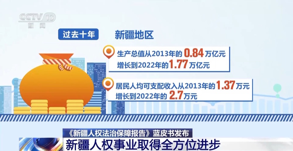 會議期間,還舉行了《新疆人權(quán)法治保障報告》藍(lán)皮書揭幕儀式。過去十年,新疆地區(qū)生產(chǎn)總值從2013年的0.84萬億元增長到2022年的1.77萬億元,居民人均可支配收入從2013年的1.37萬元增長到2022年的2.7萬元。
