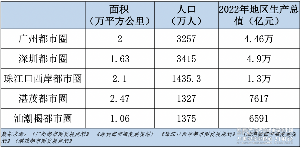 “都市圈是開放的‘圈’,是市場聯(lián)系和社會分工更密集的概念?!标慀櫽钕蛴浾弑硎?,都市圈的提出是為了協(xié)調(diào)城鄉(xiāng)發(fā)展,通過動態(tài)調(diào)整規(guī)劃不斷增強都市圈新內(nèi)涵,將釋放廣東省區(qū)域經(jīng)濟發(fā)展的新質(zhì)生產(chǎn)力。據(jù)公開數(shù)據(jù)顯示,2022年,廣州都市圈地區(qū)生產(chǎn)總值4.46萬億元,深圳都市圈4.9萬億元,珠江口西岸都市圈1.3萬億元,汕潮揭都市圈7617億元,湛茂都市圈6591億元,合計12.08萬億元。