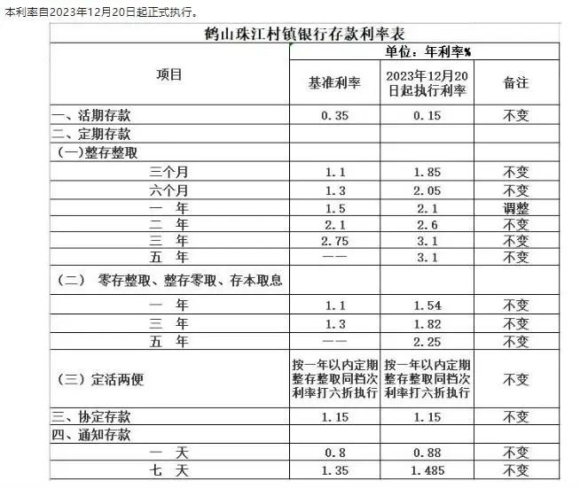鶴山珠江村鎮(zhèn)銀行調(diào)整定期存款利率通告。截圖自鶴山珠江村鎮(zhèn)銀行微信公眾號(hào)
