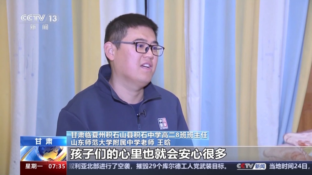 甘肅臨夏州積石山縣積石中學(xué)高二8班班主任、山東師范大學(xué)附屬中學(xué)老師 王晗:當(dāng)時著急的時候也沒有穿襪子,也沒有穿褲子,就穿了一條秋褲就出去了,就抓緊往學(xué)校跑,大約是15分鐘后我們就趕到了學(xué)校。在學(xué)生心目中,班主任在和班主任不在絕對是兩個樣,我往那一站,孩子們的心里也就會安心很多。當(dāng)然了孩子們都在,我心里也安心得多。