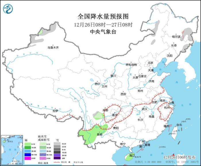 圖1 全國降水量預(yù)報圖(12月26日08時-27日08時)