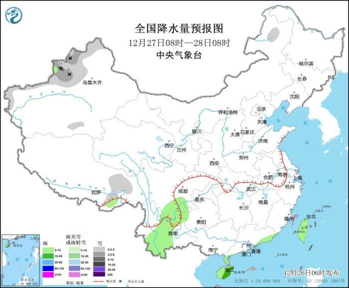 12月27日08時至28日08時,內(nèi)蒙古東北部、新疆北部和南疆西部山區(qū)、西藏東部等地部分地區(qū)有小到中雪或雨夾雪,其中,新疆北疆北部和伊犁河谷等地部分地區(qū)有大雪(5~9毫米)。云南中部、廣東東南部沿海、海南島、臺灣島等地部分地區(qū)有小到中雨(見圖2)。