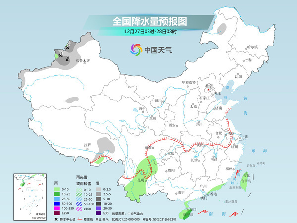 明天,內(nèi)蒙古東北部、新疆北部和南疆西部山區(qū)、西藏東部等地部分地區(qū)有小到中雪或雨夾雪,其中,新疆北疆北部和伊犁河谷等地部分地區(qū)有大雪。云南中部、廣東東南部沿海、海南島、臺灣島等地部分地區(qū)有小到中雨。