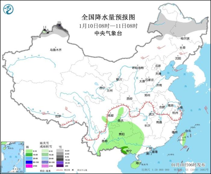 1月10日08時(shí)至11日08時(shí),內(nèi)蒙古東部、黑龍江中北部、新疆北疆北部等地部分地區(qū)有小到中雪或雨夾雪,其中,新疆北疆塔城、阿勒泰地區(qū)等地有大到暴雪,局地大暴雪(20~25毫米)。四川盆地東南部、重慶西部、貴州、云南東部、廣西、湖南西南部、海南島、臺灣島東部等地部分地區(qū)有小到中雨。內(nèi)蒙古中部、遼寧北部等地部分地區(qū)有5~6級風(fēng);渤海、渤海海峽、黃海北部和南部、東海、臺灣海峽、臺灣以東洋面、巴士海峽、南海大部等海域有6~7級風(fēng)、陣風(fēng)8~9級。