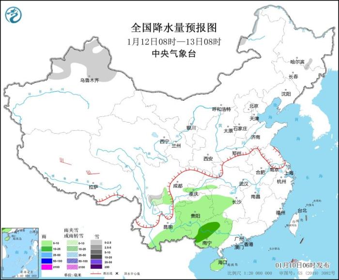 1月12日08時(shí)至13日08時(shí),新疆北疆北部、川西高原南部等地部分地區(qū)有小雪或雨夾雪。四川盆地南部、湖南西部、貴州、云南東部和南部、廣西、海南島等地部分地區(qū)有小到中雨。西藏中部部分地區(qū)有5~6級風(fēng);南海東部和西南部等海域有6~7級風(fēng)、陣風(fēng)8級。