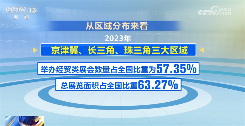 從區(qū)域分布來看,2023年京津冀、長三角、珠三角三大區(qū)域舉辦經(jīng)貿(mào)類展會數(shù)量占全國比重為57.35%,總展覽面積占全國比重63.27%。