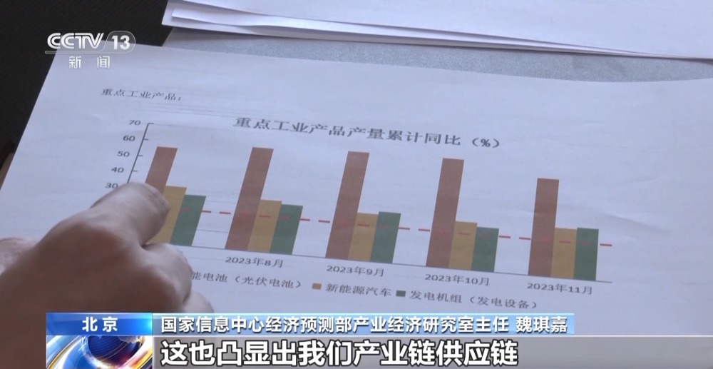 國家信息中心經(jīng)濟(jì)預(yù)測部產(chǎn)業(yè)經(jīng)濟(jì)研究室主任 魏琪嘉:像這樣的產(chǎn)品實(shí)現(xiàn)了兩位數(shù)的增長的這種態(tài)勢,其實(shí)對于一個經(jīng)濟(jì)體來講是實(shí)屬不易的。這也凸顯出我們產(chǎn)業(yè)鏈供應(yīng)鏈配套能力的大幅提升。產(chǎn)品背后蘊(yùn)含的是技術(shù)、要素的優(yōu)化組合,催生出新的生產(chǎn)能力,其實(shí)也是我們經(jīng)濟(jì)發(fā)展中的這種亮點(diǎn)。