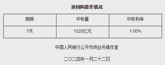 中新網1月22日電 據(jù)央行網站消息,為維護銀行體系流動性合理充裕,2024年1月22日人民銀行以利率招標方式開展了1220億元逆回購操作,中標利率1.80%,期限為7天。具體情況如下: