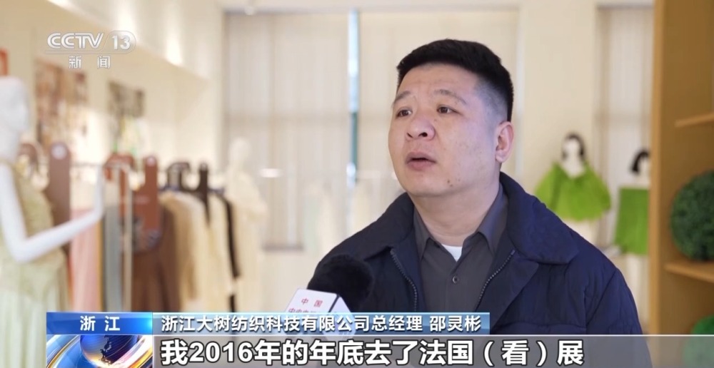 浙江大樹紡織科技有限公司總經(jīng)理 邵靈彬:我2016年的年底去了法國看展,基本上是奢侈品買面料的一個展會。我當(dāng)時給自己設(shè)的一個夢想,10年之內(nèi)我想進(jìn)展會。