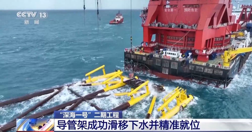 中國海油“深海一號”二期工程導(dǎo)管架海上安裝首席 黎世龍:“深海一號”二期工程導(dǎo)管架海上安裝采用滑移下水方式進(jìn)行。這種方式是利用導(dǎo)管架自身重力并配合液壓千斤頂助推,使導(dǎo)管架從駁船平穩(wěn)地滑入海中,再通過起重船將導(dǎo)管架吊裝扶正坐底,從而實(shí)現(xiàn)安裝就位。
