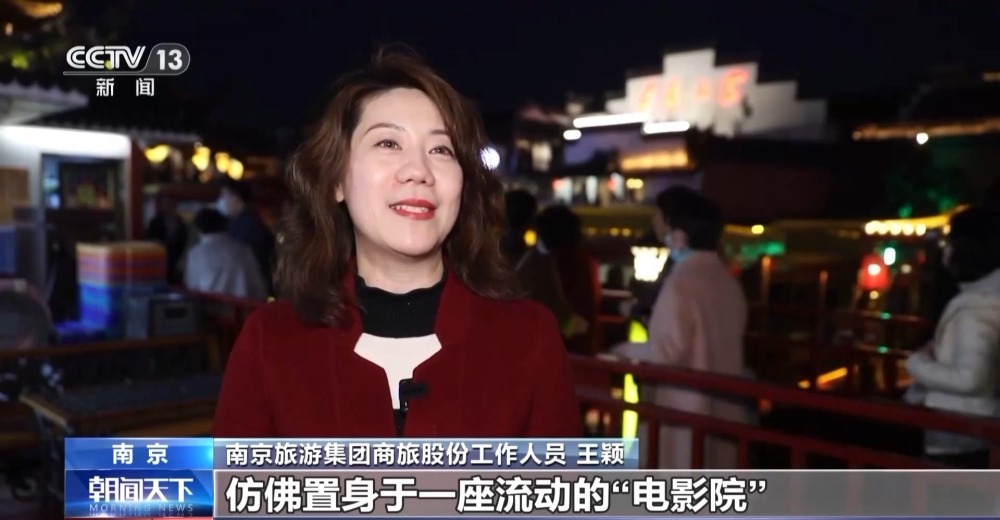 南京旅游集團(tuán)商旅股份工作人員 王穎:每艘游船上都裝有GPS定位系統(tǒng),再配合沿岸的燈光、投影,讓游船在行駛途中仿佛置身于一座流動“電影院”,完整地貫通、復(fù)刻“十里秦淮”的歷史景象。