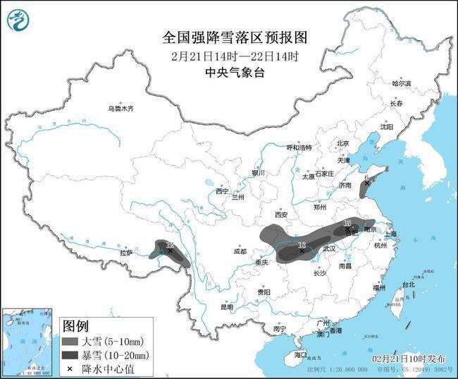 中央氣象臺(tái)2月21日10時(shí)繼續(xù)發(fā)布暴雪黃色預(yù)警:預(yù)計(jì)2月21日14時(shí)至22日14時(shí),山東東南部、河南南部、安徽中部、江蘇中部、湖北大部、湖南北部、重慶東部和北部、四川東北部、西藏東部等地有大雪,其中,安徽中部、湖北南部和東部、湖南北部、西藏東部等地的部分地區(qū)有暴雪(10~18毫米)。上述地區(qū)新增積雪深度3~7厘米,局地可達(dá)10厘米以上。