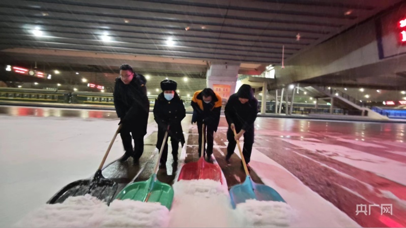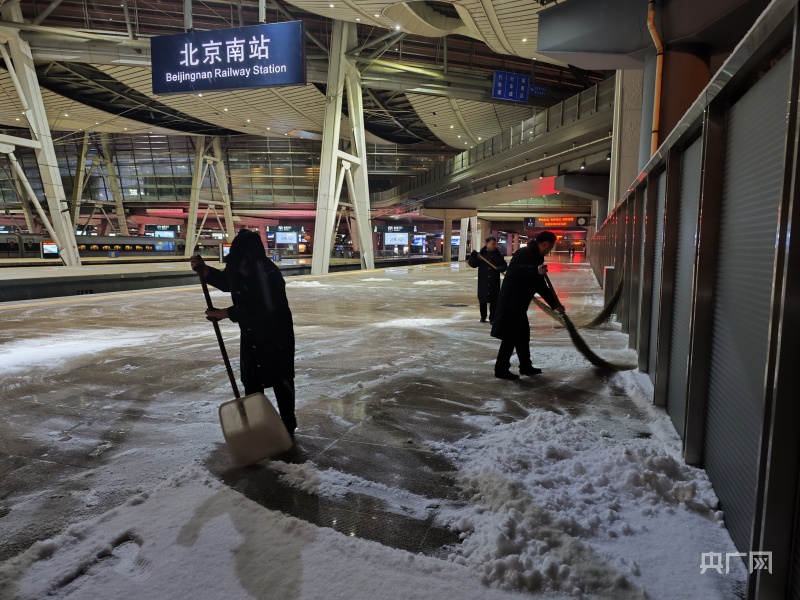 北京南站第一時間啟動預警和應急響應,組織除雪突擊隊及時清掃站臺等處的積雪,確保旅客乘降安全。