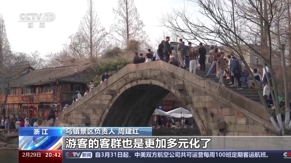 烏鎮(zhèn)景區(qū)負(fù)責(zé)人 周建紅:二月份來看,我們整個(gè)線上營銷比例已經(jīng)超過了線下,占比達(dá)到了60%,旅游產(chǎn)品也是在做不斷的一個(gè)迭代,游客的客群也是更加多元化了。十年前的春節(jié),游客量在20多萬,那這一次的春節(jié)的話,我們已經(jīng)是突破了50萬人次,也是翻倍的一個(gè)增長。