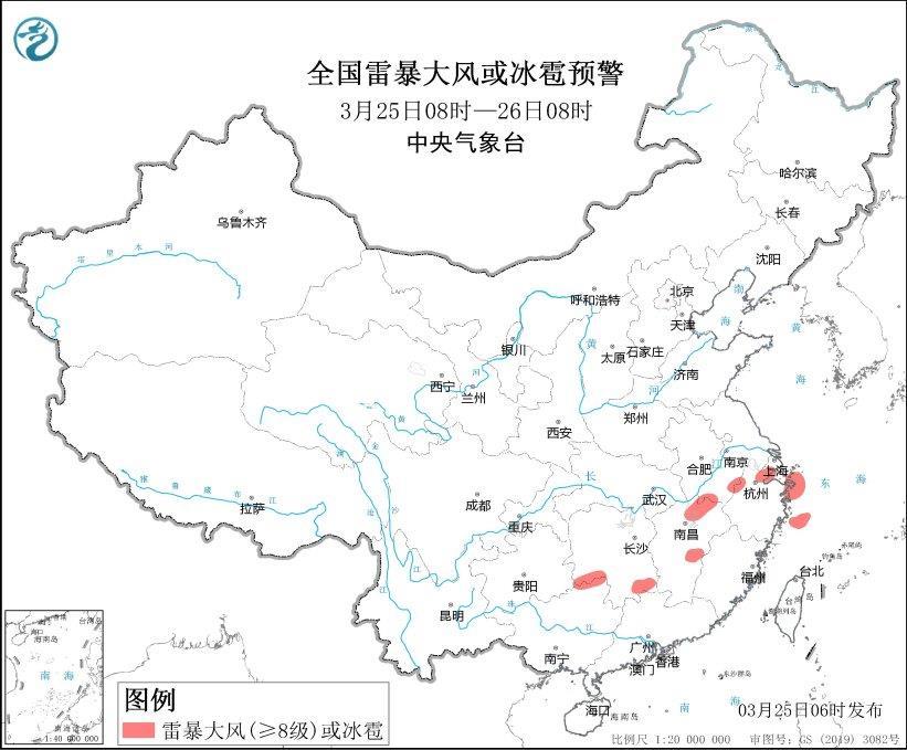 預(yù)計3月25日08時至26日08時,安徽南部、湖南南部、江西中北部、浙江北部、廣西東北部等地的部分地區(qū)將有8—10級雷暴大風或冰雹天氣;安徽南部、江蘇南部、上海西南部、湖南南部、江西、浙江中北部和東南部、福建西北部、廣西東北部等地的部分地區(qū)將有短時強降水天氣,最大小時雨量20-40毫米,局地可達50毫米以上。