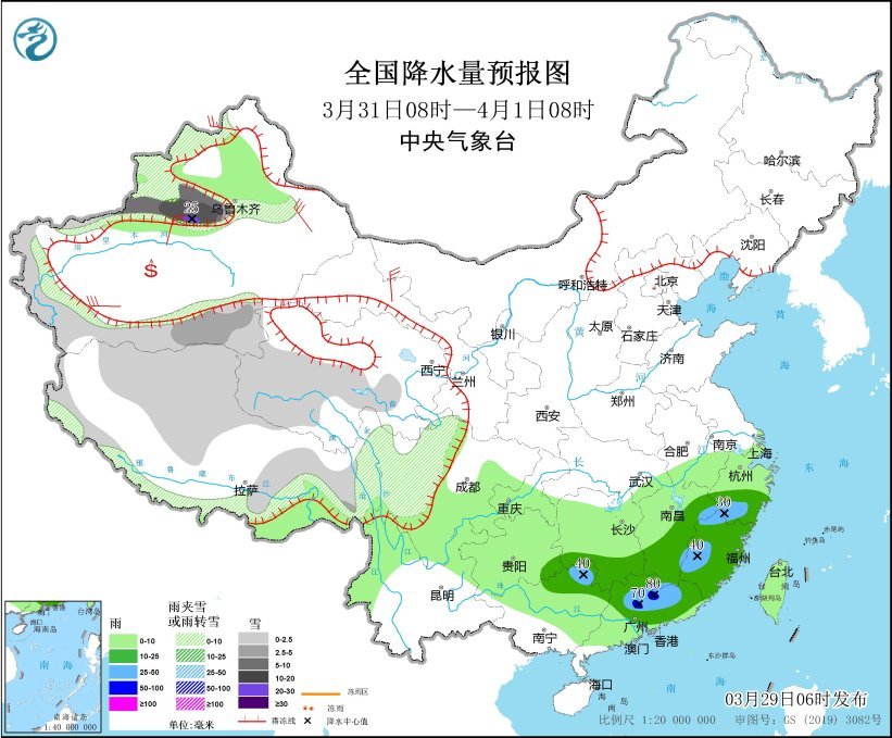 3月30日8時(shí)至31日8時(shí),黑龍江北部、新疆南疆高海拔山區(qū)、西藏大部、青海西部、川西高原南部等地部分地區(qū)有小到中雪或雨夾雪。湖南中南部、江南中南部、福建大部、廣西西北部、廣東大部等地部分地區(qū)有中到大雨,其中,湖南東南部、江西西南部和東部、福建西部、廣西東北部、廣東西部等地部分地區(qū)有暴雨或大暴雨(100~120毫米)。內(nèi)蒙古東南部、新疆東部等地部分地區(qū)有4~5級(jí)風(fēng)。