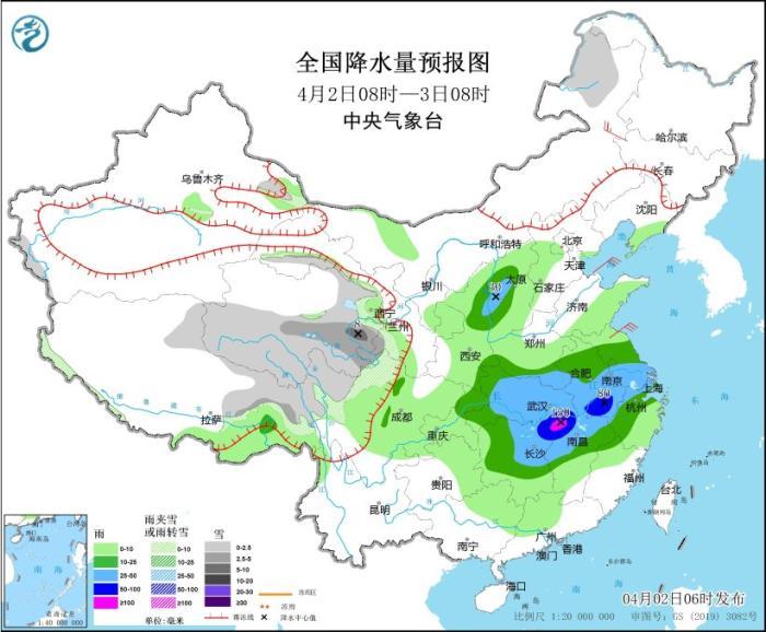 4月2日08時(shí)至3日08時(shí),內(nèi)蒙古東北部、西藏東部、甘肅河西、青海中南部、川西高原北部等地部分地區(qū)有小雪或雨夾雪,其中,西藏東南部、青海東南部、甘肅西南部等地部分地區(qū)有中到大雪(5~8毫米)。陜西東部、山西西部、黃淮南部、江淮大部、江漢、江南北部、四川盆地東部、重慶東北部等地部分地區(qū)有中到大雨,其中,湖北東南部、湖南東北部、安徽東南部、江西東北部等地部分地區(qū)有暴雨,局地大暴雨(100~150毫米)。內(nèi)蒙古東北部部分地區(qū)有4~5級(jí)風(fēng)。