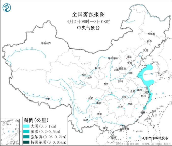 預(yù)計(jì),4月2日白天,黃海中西部海域、山東半島東部和南部沿岸海域、浙江沿岸海域?qū)⒂心芤?jiàn)度不足1公里的大霧。此外,4月2日傍晚至3日早晨,黃海西南部海域、江蘇中部和南部沿岸海域、長(zhǎng)江口附近海域、杭州灣附近海域、浙江中北部沿岸海域?qū)⒂心芤?jiàn)度不足1公里的大霧。中央氣象臺(tái)4月2日06時(shí)繼續(xù)發(fā)布大霧黃色預(yù)警。