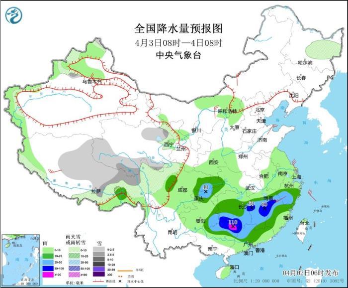4月3日08時(shí)至4日08時(shí),新疆北疆北部和伊犁河谷沿天山一帶、西藏北部、青海東北部和南部、甘肅河西、川西高原北部、黑龍江東部等地部分地區(qū)有小到中雪或雨夾雪。江南中南部、西南地區(qū)東北部、華南北部等地部分地區(qū)有中到大雨,其中,湖南西南部、江西中部、廣西東北部、廣東西北部等地部分地區(qū)有暴雨或大暴雨(100~110毫米)。內(nèi)蒙古河套地區(qū)和中部、新疆沿天山地區(qū)、西藏南部等地部分地區(qū)有4~5級(jí)風(fēng)。