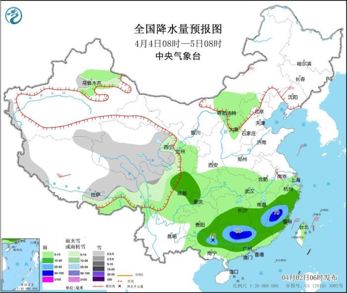 4月4日08時(shí)至5日08時(shí),新疆沿天山地區(qū)、西藏南部和東部、青海中南部、甘肅河西、川西高原北部等地部分地區(qū)有小到中雪或雨夾雪。四川盆地大部、重慶西南部、貴州東南部、江南中南部、華南中北部等地部分地區(qū)有中到大雨,其中,福建西北部、廣西東北部、廣東西北部等地部分地區(qū)有暴雨(50~80毫米)。內(nèi)蒙古中部、遼寧北部、西藏南部等地部分地區(qū)有4~5級(jí)風(fēng)。