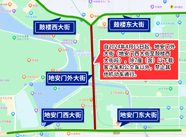 為確保全國(guó)重點(diǎn)文物保護(hù)單位“大運(yùn)河——玉河故道(澄清上閘含萬寧橋)”的文物安全與交通安全,根據(jù)文物保護(hù)和道路交通安全有關(guān)法律法規(guī)規(guī)定,決定自2024年4月15日起,地安門外大街(地安門西大街至鼓樓西大街段),除7座(含)以下載客汽車和公交車以外,禁止其他機(jī)動(dòng)車通行。