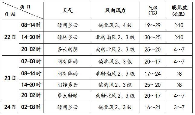 預(yù)計(jì)24-28日期間,大部分時(shí)間本市天氣為晴到多云。受弱冷空氣影響,25日有3、4級偏北風(fēng)。該期間氣溫較為平穩(wěn),白天最高氣溫28~30℃,夜間最低氣溫14~16℃。