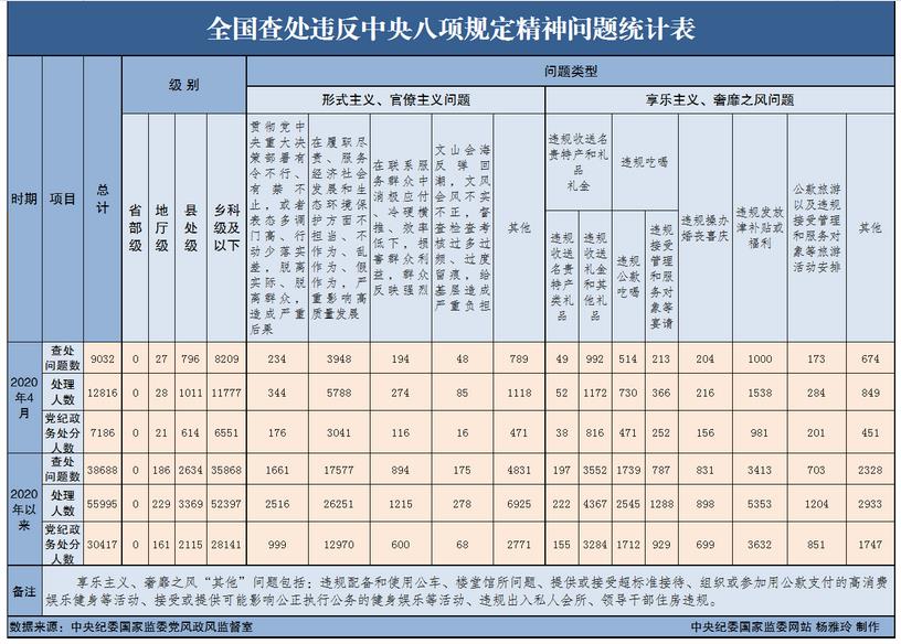據(jù)介紹,為掌握全國(guó)貫徹落實(shí)中央八項(xiàng)規(guī)定精神情況,中央紀(jì)委國(guó)家監(jiān)委在各省區(qū)市和新疆生產(chǎn)建設(shè)兵團(tuán)、各中央和國(guó)家機(jī)關(guān)、各中央企業(yè)和中央金融企業(yè)等建立了落實(shí)中央八項(xiàng)規(guī)定精神情況月報(bào)制度。2020年以來(lái),截至4月30日,全國(guó)查處違反中央八項(xiàng)規(guī)定精神問(wèn)題情況如下: