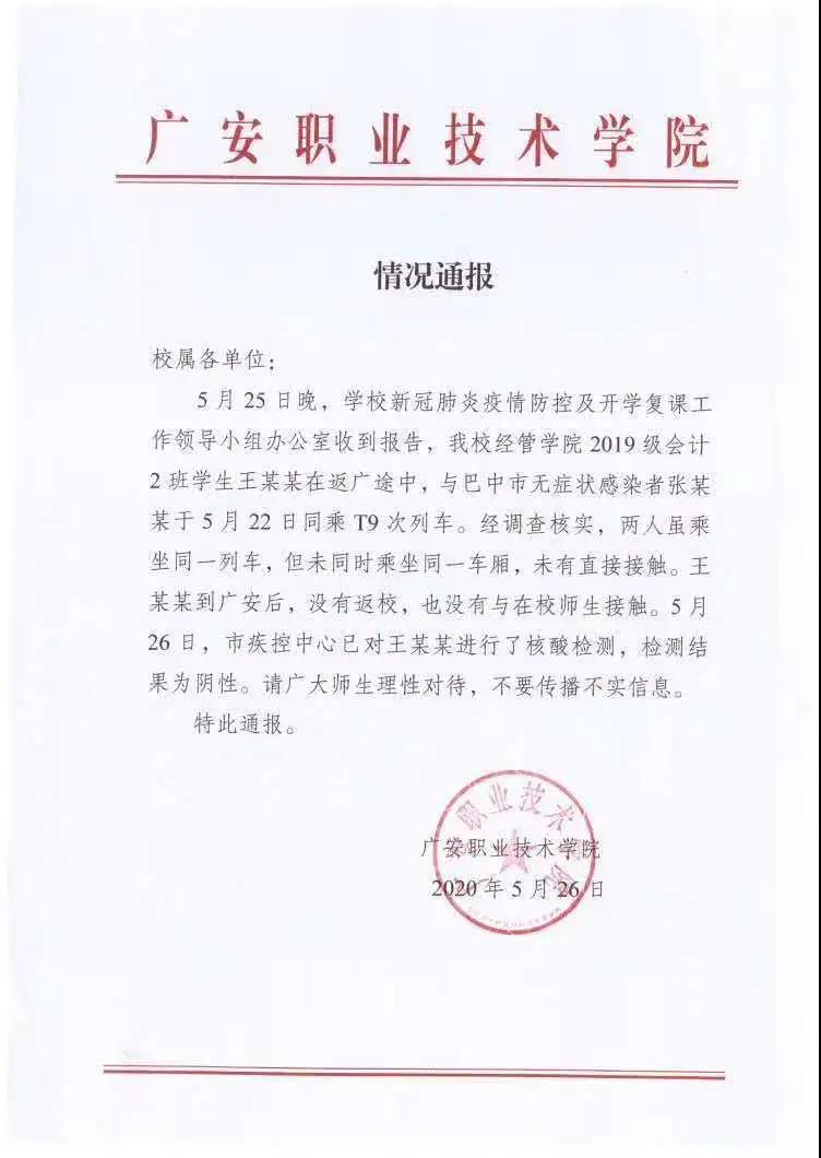 公告稱, 5月25日晚,廣安職業(yè)技術(shù)學院新冠肺炎疫情防控及開學復課工作領(lǐng)導小組辦公室收到報告,該校經(jīng)管學院2019級會計2班學生王某某在返廣(安)途中,與巴中市無癥狀感染者張某某于5月22日同乘T9次列車。經(jīng)調(diào)查核實,兩人雖乘坐同一列車,但未同時乘坐同一車廂,未有直接接觸。王某某到廣安后,沒有返校,也沒有與在校師生接觸。5月26日,廣安市疾控中心對王某某進行核酸檢測,檢測結(jié)果為陰性。