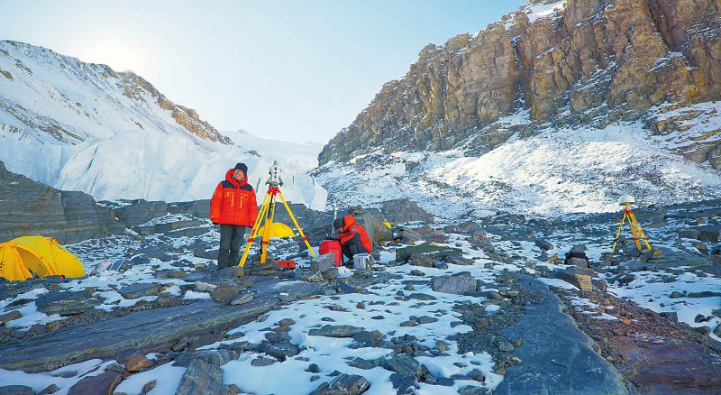 更多測(cè)繪人的日常被記錄下來(lái)。史志剛,重力測(cè)量組組長(zhǎng),除完成珠峰地區(qū)加密重力測(cè)量之外,他還完成海拔5200米至6000米所有6個(gè)交會(huì)點(diǎn)的重力測(cè)量,成為本次珠峰高程測(cè)量項(xiàng)目中,唯一一個(gè)走遍所有交會(huì)測(cè)量點(diǎn)的人。王戰(zhàn)勝,在本次珠峰高程測(cè)量中負(fù)責(zé)高程導(dǎo)線(xiàn)、GNSS測(cè)量和東絨3點(diǎn)的交會(huì)測(cè)量工作。他攀冰跨河,4次到達(dá)海拔最高的東絨3交會(huì)點(diǎn)。鄭林,大本營(yíng)交會(huì)測(cè)量組組長(zhǎng),帶著年輕隊(duì)員武光偉克服了距離峰頂遠(yuǎn)、交會(huì)測(cè)量難度大的困難,完成珠峰大本營(yíng)的交會(huì)測(cè)量及基準(zhǔn)站值守工作……