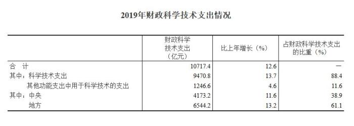 2019年,國家財政科學技術(shù)支出10717.4億元,比上年增加1199.2億元,增長12.6%。其中,中央財政科學技術(shù)支出4173.2億元,增長11.6%,占財政科學技術(shù)支出的比重為38.9%;地方財政科學技術(shù)支出6544.2億元,增長13.2%,占比為61.1%。