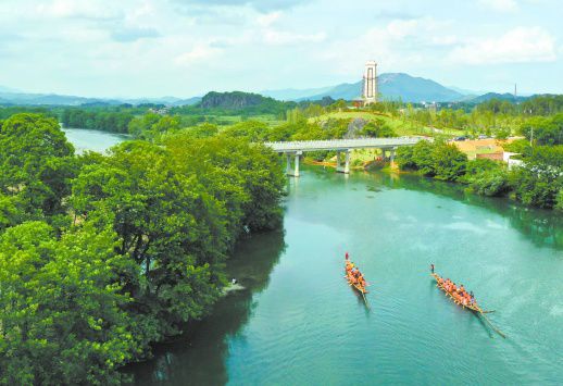 5月26日,道縣洑水河梅花貴頭段,村民在河面上劃龍舟。近年,道縣堅持以生態(tài)立縣,實施退耕還林、封山育林、水土保持、礦山植被修復等生態(tài)工程,不斷擴大森林面積,提高水源涵養(yǎng)能力,全縣生態(tài)持續(xù)向好,呈現(xiàn)出“河清、岸綠、景美”的生態(tài)景觀。(蔣克青 雷伙生 攝影報道)
