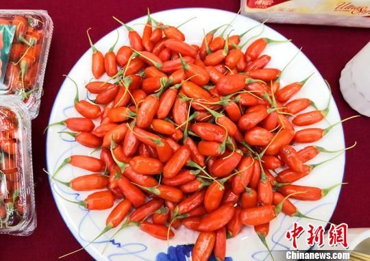 6月28日,甘肅省靖遠(yuǎn)縣2019年文化旅游農(nóng)特產(chǎn)品天津?qū)?chǎng)推介會(huì)在天津舉行。圖為枸杞鮮果展示?!⒂裉摇z