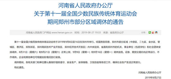 第十一屆全國(guó)少數(shù)民族傳統(tǒng)體育運(yùn)動(dòng)會(huì)期間鄭州部分區(qū)域調(diào)休