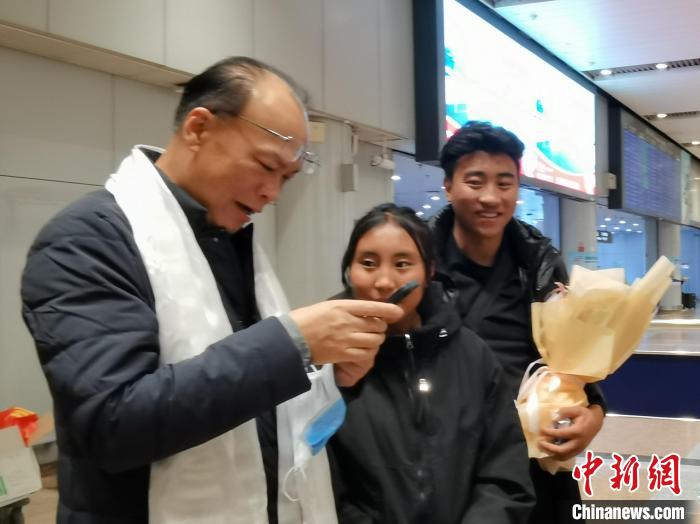11月14日下午,來自西藏自治區(qū)昌都市的8名脊柱側彎患者到達北京首都國際機場。圖為北京大學第一醫(yī)院骨科主任李淳德(左)和藏族女孩澤巴央宗、哥哥貢布鄧珠交談。 徐雪瑩 攝