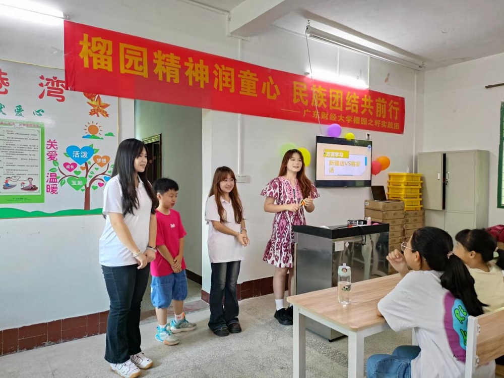 7月7日-7月13日,廣東財(cái)經(jīng)大學(xué)“榴園之籽”實(shí)踐團(tuán)組織了廣財(cái)大的各民族精英大學(xué)生到興寧市開展鄉(xiāng)村支教活動(dòng),隊(duì)員們教授民族特色歌舞、繪畫手工、武術(shù)體育和勞動(dòng)教育等內(nèi)容,助力兒童德智體美勞全面發(fā)展。隊(duì)員們還為兒童展示各民族的文化特色,讓他們感受到不同民族文化的魅力,并通過講述廣東人民援疆、援藏的事跡,特別是“榴園”校友黃海芬扎根西藏奉獻(xiàn)的事跡,引導(dǎo)孩子們鑄牢中華民族共同體意識(shí)。隊(duì)員們?cè)谥Ы讨袀鬟f“榴園精神”,鼓勵(lì)孩子們一起學(xué)習(xí)“凝心聚力、團(tuán)結(jié)奮斗”的“榴園精神”,激勵(lì)他們勤奮向?qū)W、學(xué)會(huì)感恩,長(zhǎng)大成才后回饋家鄉(xiāng)和社會(huì)。