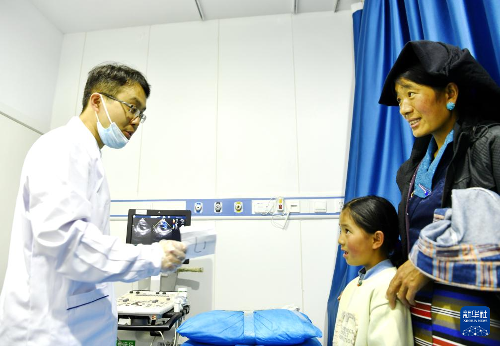 7月23日,南京醫(yī)科大學(xué)附屬兒童醫(yī)院副主任醫(yī)師胡銳在墨竹工卡縣與已做心臟超聲檢查的兒童及其家長(zhǎng)交流。新華社記者 張汝鋒 攝